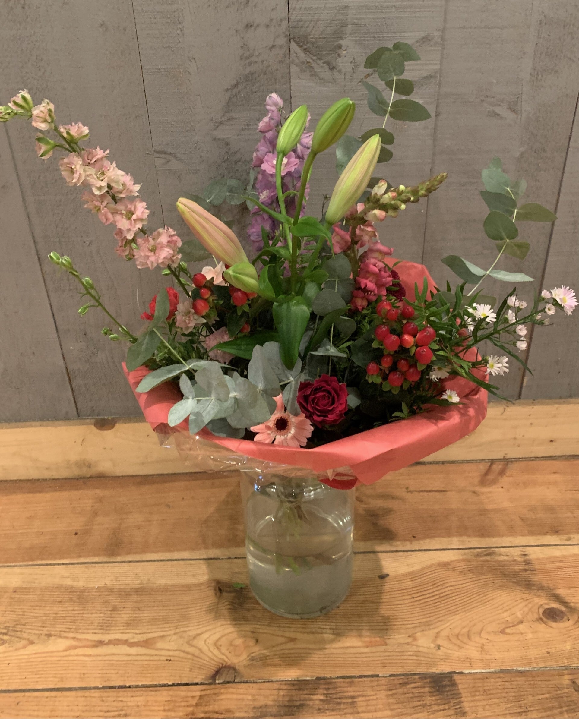 De bloemen zijn handgebonden en kunnen, afhankelijk van het seizoen, en beschikbaarheid, enigszins afwijken van de afbeelding Wij zoeken altijd naar een vergelijkbaar altenatief